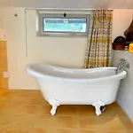 Tesis bahçe manzaralıdır. Banyoda banyo küveti, duş bulunmaktadır.